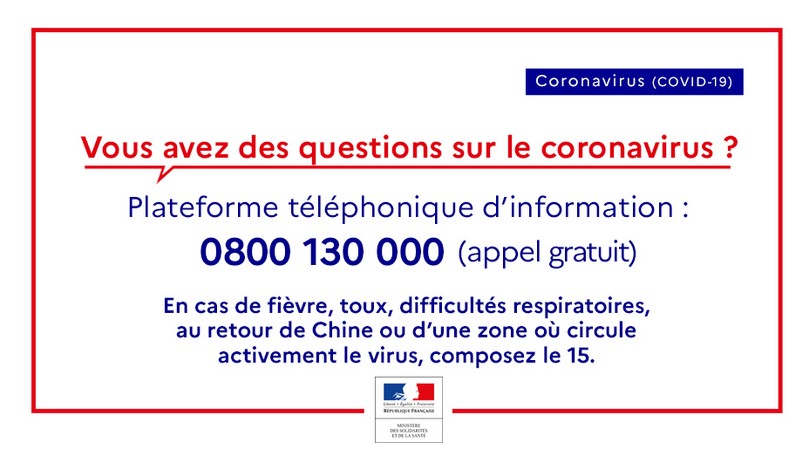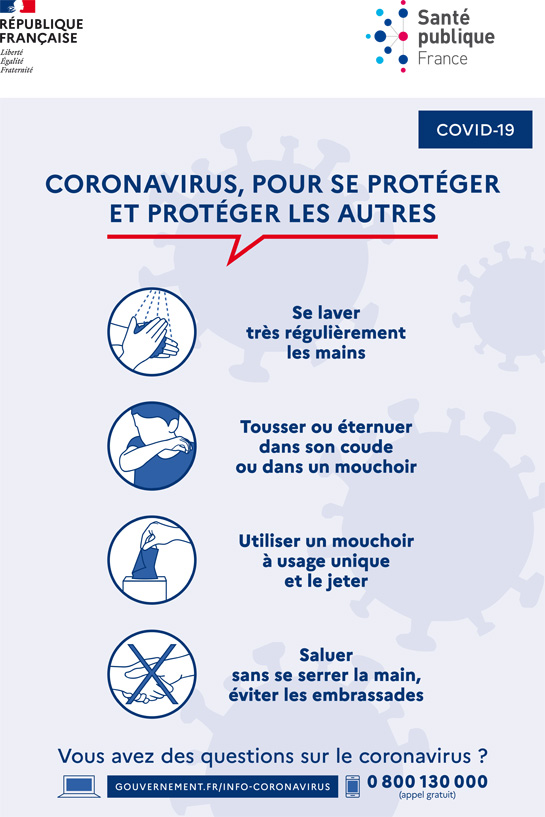 CORONAVIRUS - COVID-19 : GESTES BARRIERES La situation pouvant évoluer rapidement, vous pouvez la suivre sur :- le site du Gouvernement : https://www.gouvernement.fr/ - le site du Ministère des solidarités et de la Santé : https://solidarites-sante.gouv.fr/