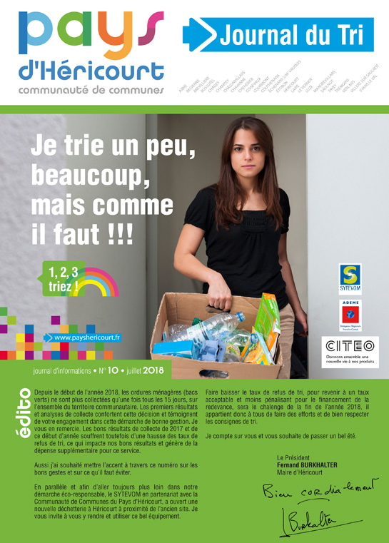 Le Journal du Tri Journal du Tri n°10 - Juillet 2018Je trie un peu, beaucoup,mais comme il faut !!! Cliquez ci-dessous pour télécharger le Journal du Tri Fichier(s) à télécharger Le Journal du Tri - n°10 - Je trie un peu, beaucoup ... 2.93 Mo PDF Le Journal du Tri - n°9 - Ce qui change en 2018 3.09 Mo PDF Le Journal du Tri - n°8 - Ce qui change en 2017 1.69 Mo PDF Le Journal du Tri - n°7 - Spécial Tarifs 2eme Semestre 2015 4.11 Mo PDF Le Journal du Tri - n°6 - Redevance incitative Tarifs 2015 1.76 Mo PDF Le Journal du Tri - n°5 - La redevance incitative comment ça marche ? 1.4 Mo PDF